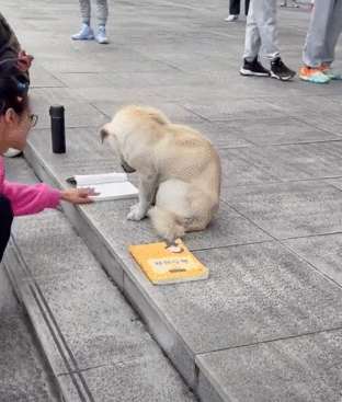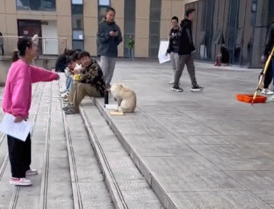 有好奇的学生走上前,想看看狗狗究竟在看什么书这么入迷。